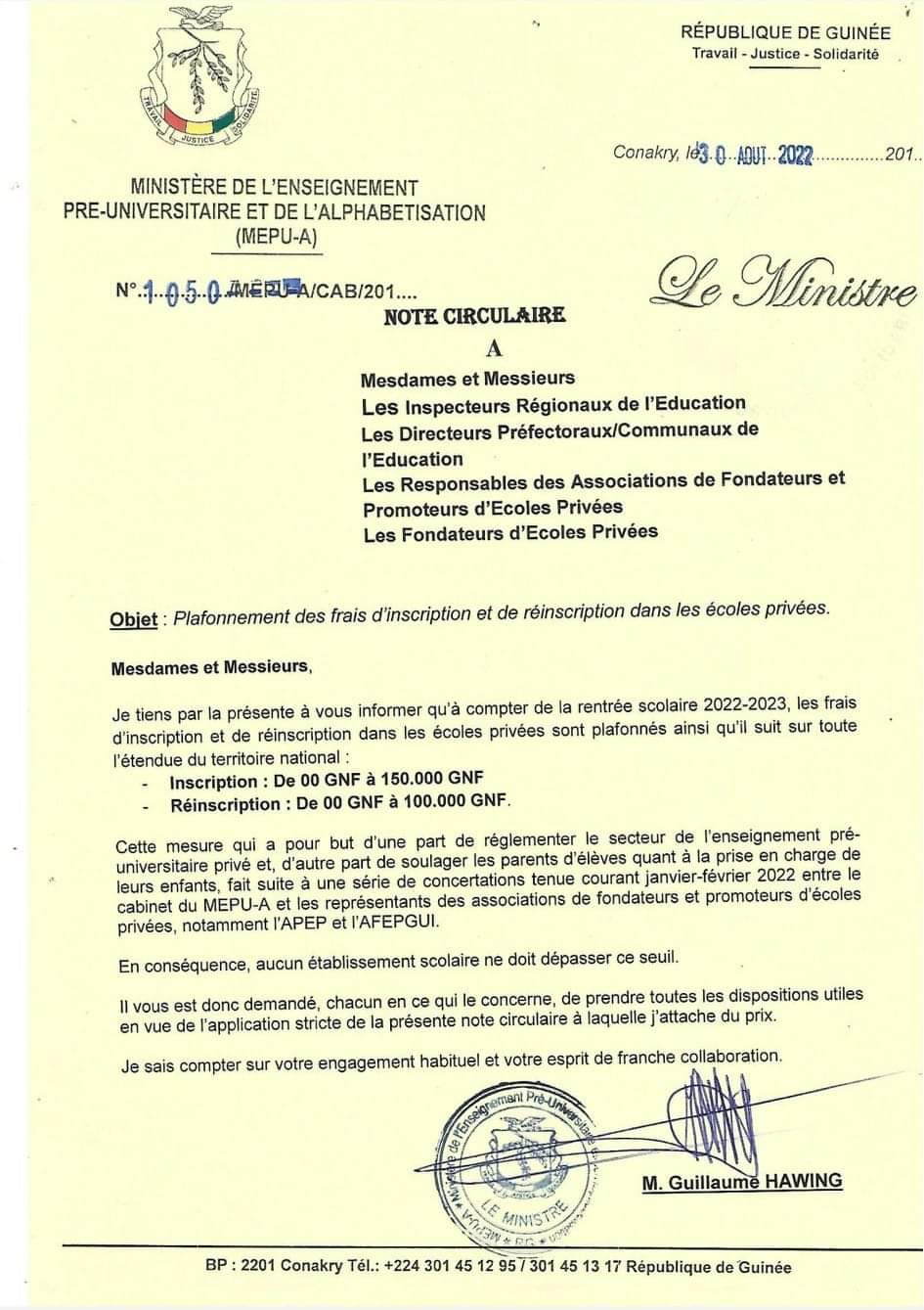 Désormais, les frais d’inscription ne doivent pas dépasser 150 000 gnf et de réinscription sont au plus à 100 000 gnf.