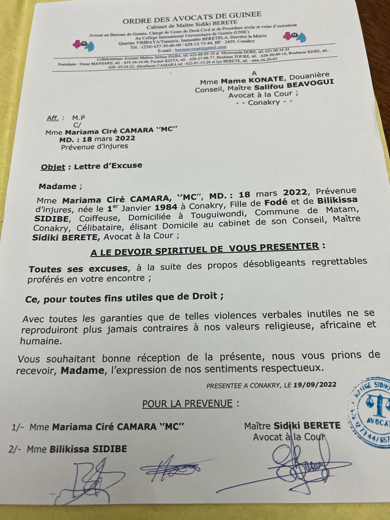 Suite à leur réconciliation scellée hier lundi grâce à l’implication de leurs avocats [Me Sidiki Bérété et Me Salifou Béavogui], la douanière Mame Konaté, épouse du célèbre artiste Ibro Diabaté a adressé, ce mardi 20 septembre une lettre à l’endroit du président du tribunal de première instance de Mafanco pour lui faire part de son désistement vis-à-vis de la vlogueuse, Mariama Ciré Camara (MC).