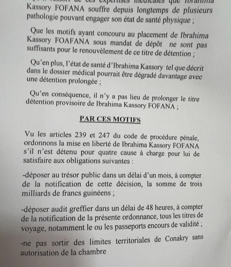 Le juge de la 1ère chambre de l’instruction de la Cour de répression des infractions économiques et financières (CRIEF), a décidé de libérer Ibrahima Kassory Fofana, ancien premier ministre, dont l’ « état de santé tel que décrit dans le dossier médical pourrait être dégradé davantage avec une détention prolongée ». Cependant selon une source proche de la défense de l’ancien premier ministre, le procureur Aly Touré a introduit un recours contre la décision. Lire ci-dessous l’extrait de la décision du juge.