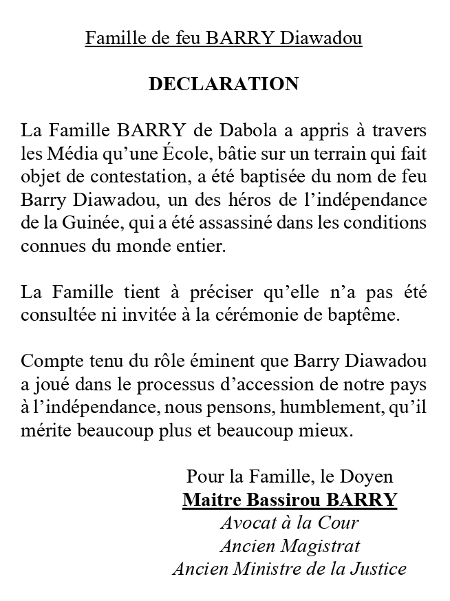 La famille Diawadou Barry a réagi à la baptisation de l’école primaire de Dixinn Port. La déclaration signée de l’ancien ministre de la Justice Me Bassirou Barry, note que la famille n’a ni été consultée ni invitée à la cérémonie de baptême. Mais, pense que Barry Diawadou mérite beaucoup plus et beaucoup mieux »
