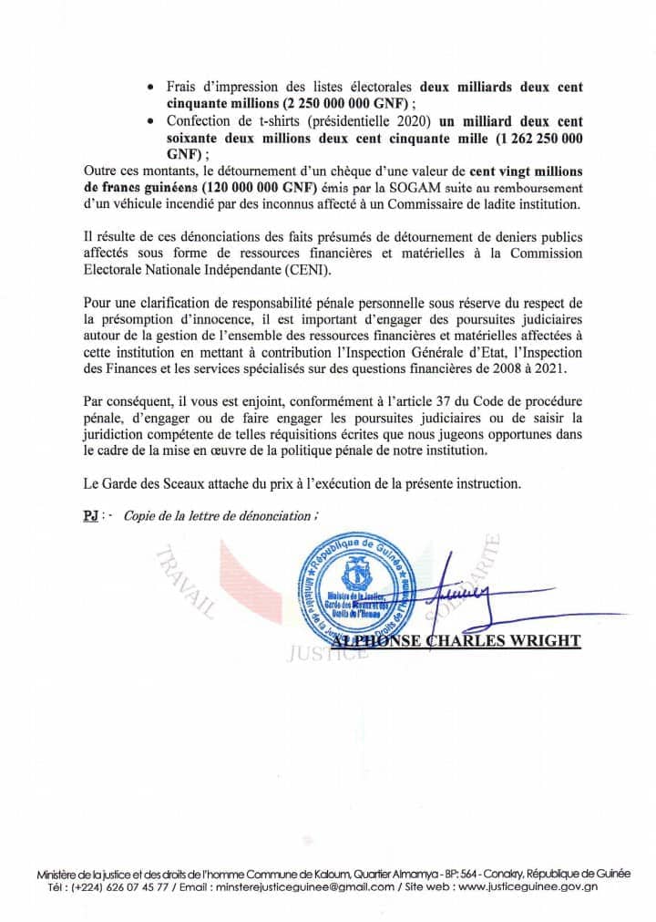 Le ministre de la Justice et des Droits de l’homme, Alphonse Charles Wright, a demandé au procureur général près la cour d’appel de Conakry, d’engager des poursuites judiciaires contre Kabinet Cissé, ancien président de la CENI et Amara Diabaté ancien DAF de la même institution. Il leur reproche des faits présumés d’enrichissement illicite, de détournements de deniers publics et complicité, portant sur la somme de 400 milliards de francs guinéens.