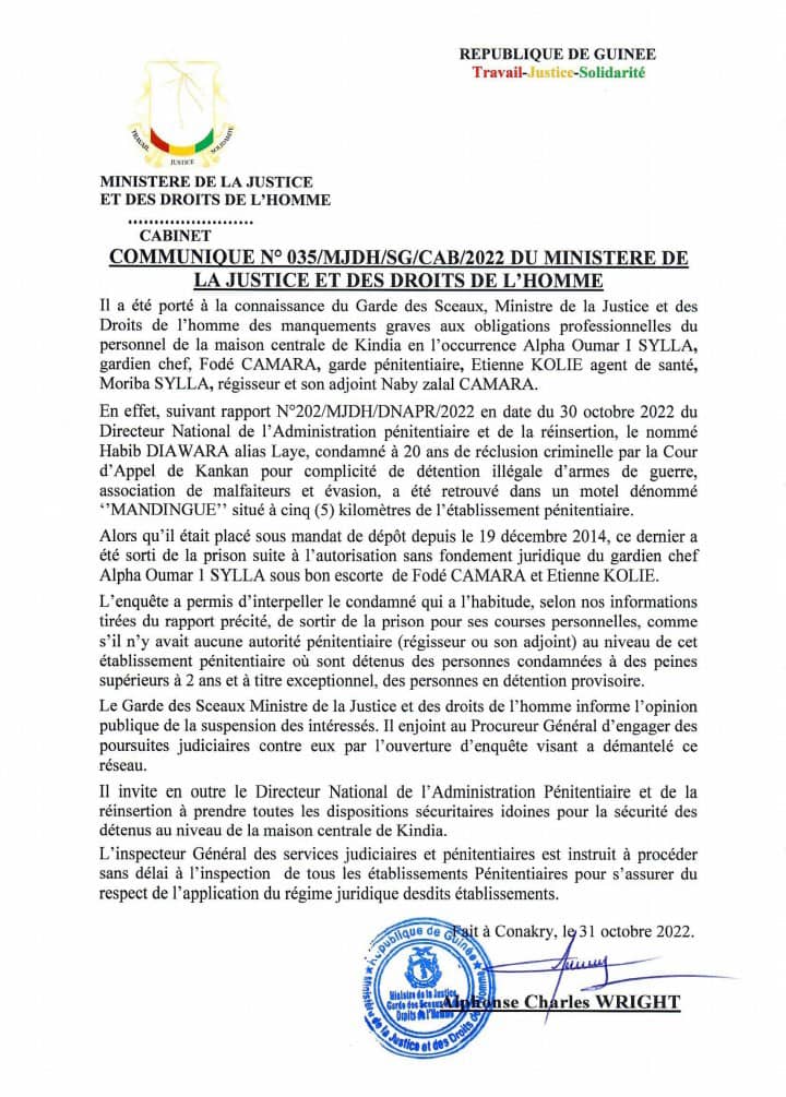 Le garde des sceaux, ministre de la justice et des droits de l’Homme a annoncé ce lundi 31 octobre, la suspension de quelques responsables de la maison centrale Kindia et ordonné des poursuites judiciaires contre eux pour « manquements graves aux obligations professionnelles ».