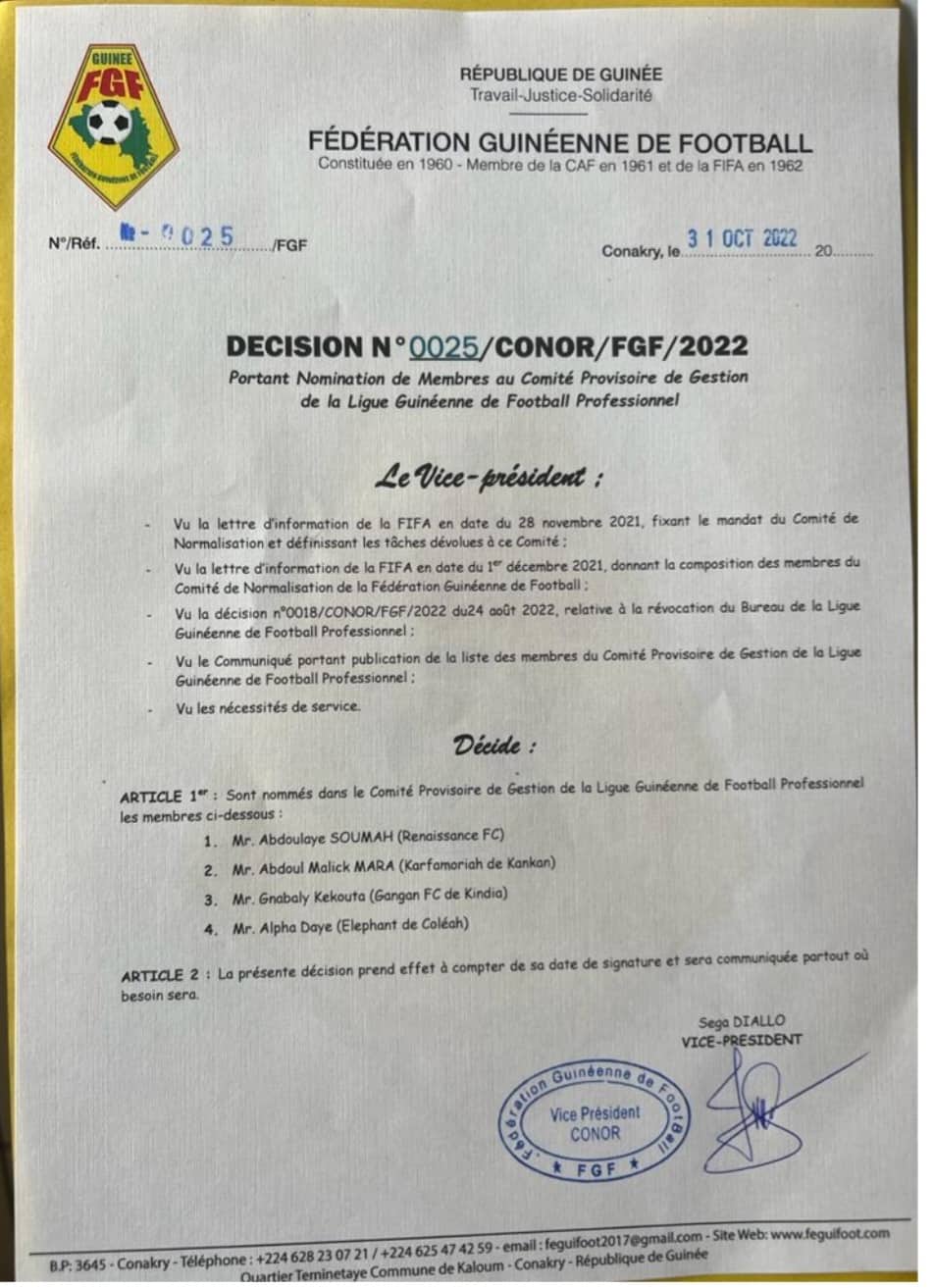 A travers un courrier en date de ce 31 octobre, signé du vice-président du Comité de normalisation de la fédération guinéenne de football, l’institution a procédé à la recomposition du bureau provisoire de la gestion de la ligue.