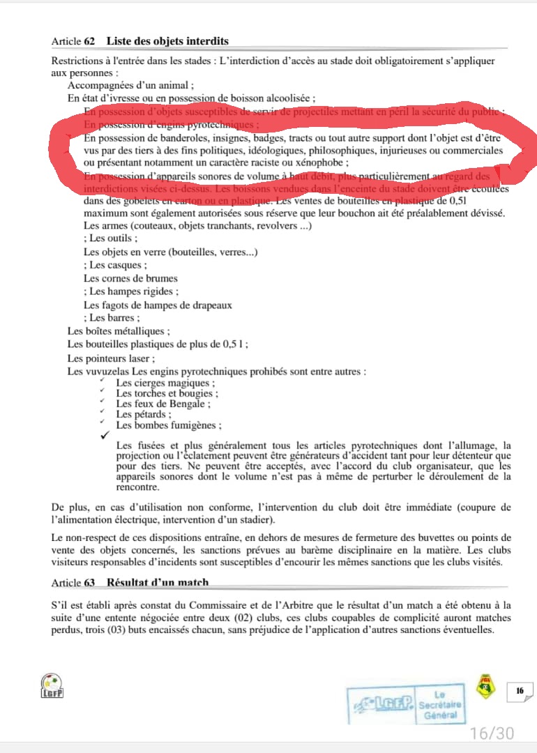 A l’ouverture du championnat de Ligue 1 de cette année au stade Petit Sory, deux grosses affiches magnifiaient les « actions » du président de la Transition, le colonel Mamadi Doumbouya (voir photo). Le hic ? Selon le règlement du championnat de Ligue 1 de cette année ; les banderoles, insignes, badges, dont l’objet est d’être vus par des tiers à des fins politiques notamment font partie de la liste des objets interdits dans les stades.