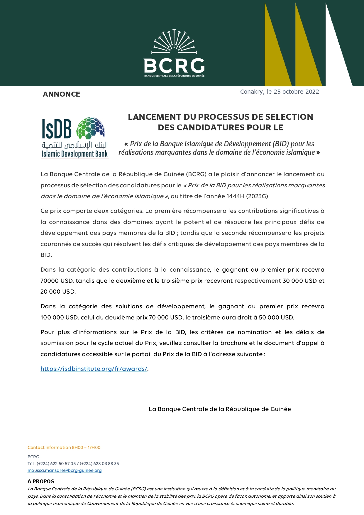 La Banque Centrale de la République de Guinée (BCRG) a le plaisir d’annoncer le lancement du processus de sélection des candidatures pour le « Prix de la BID pour les réalisations marquantes dans le domaine de l’économie islamique », au titre de l’année 1444H (2023G).