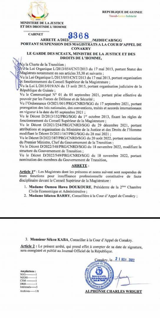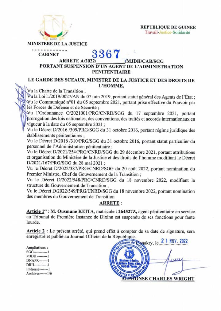 L’article Justice : le ministre Wright suspend trois magistrats et un agent pénitentiaire est apparu en premier sur Mediaguinee.org.