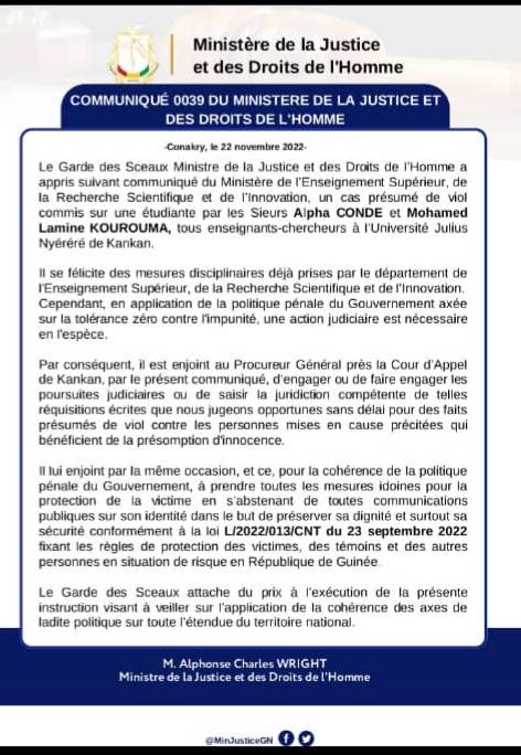 Le ministre de la justice, Alphonse Charles Wright, instruit au procureur de la Cour d’appel de Kankan, d’instruire ou de faire instruire, contre Alpha CONDE et Mohamed Lamine KOUROUMA, tous enseignants-chercheurs à l’Université Julius Nyéréré de Kankan, des poursuites pour des faits de viol présumé sur une étudiante.
