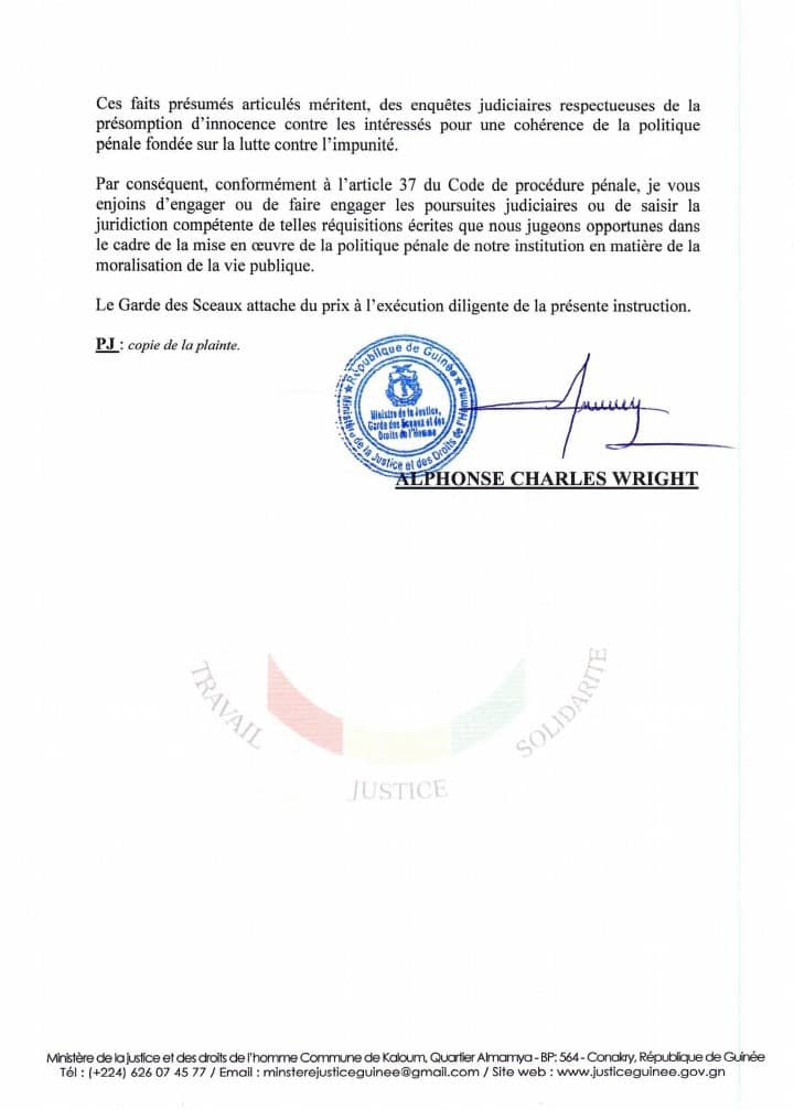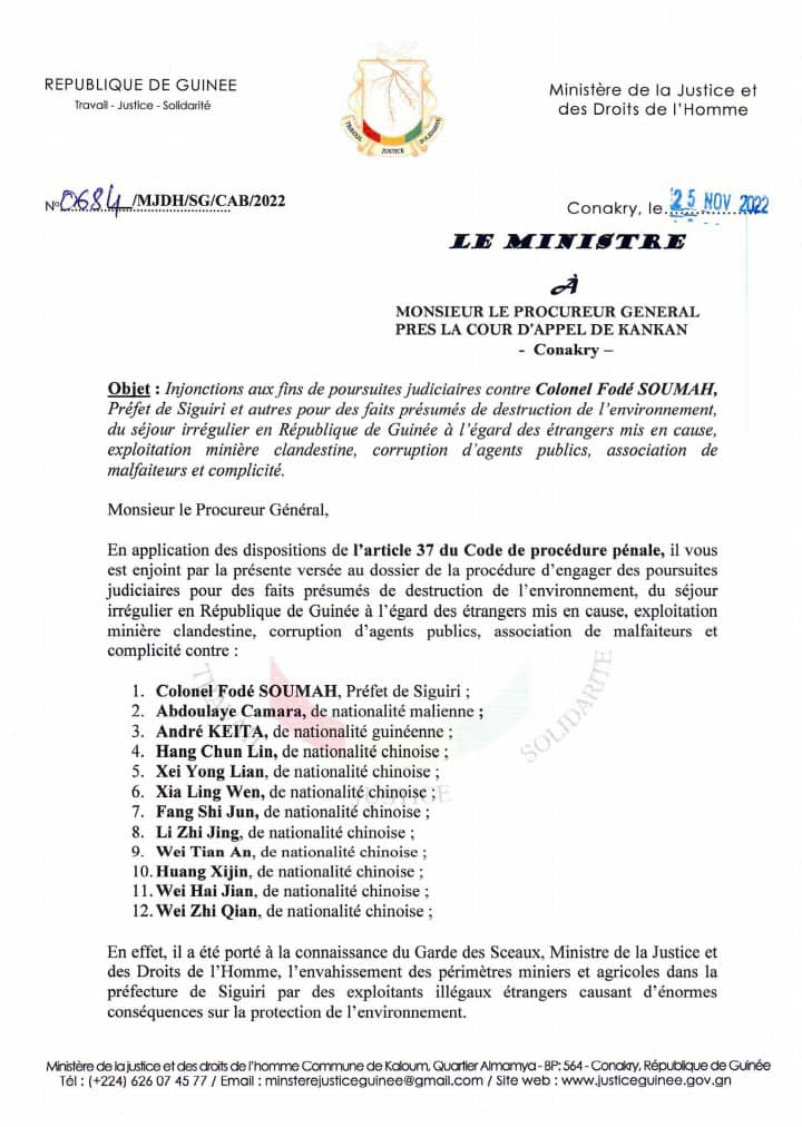 Le ministre de la Justice, Alphonse Charles Wright, a demandé de poursuivre le préfet de Siguiri, Colonel Fodé Soumah et 11 étrangers de nationalités malienne et chinoise, pour des faits présumés de « destruction de l’environnement, de séjour irrégulier en République de Guinée ». Et à l’égard des étrangers, l’ « exploitation minière clandestine, corruption d’agents publics, association de malfaiteurs et complicité ».