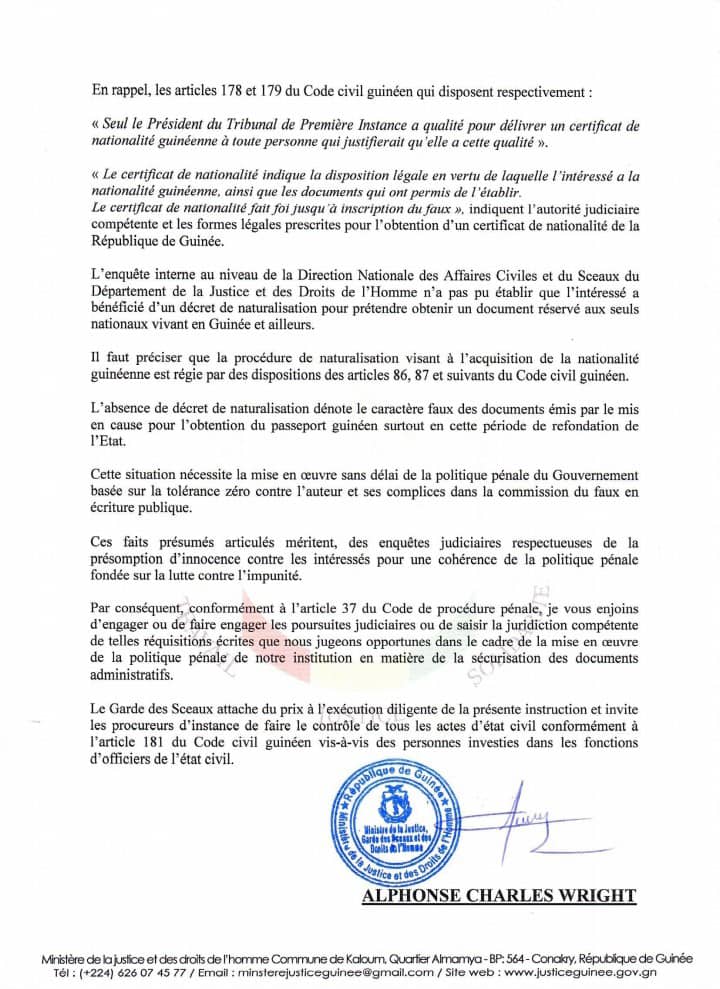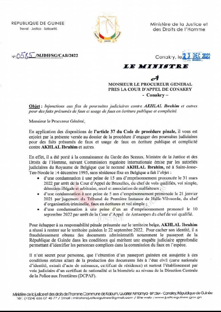 Pour faire la lumière sur l’obtention « frauduleuse » de documents administratifs guinéens par Akhilal Ibrahim, réfugié en Guinée pour fuir la justice belge qui l’a condamné à plusieurs reprises, le ministre de la justice guinéenne, Alphonse Charles Wright, a instruit des poursuites judiciaires contre le concerné et d’autres personnes pour des faits présumés de faux et usage de faux en écriture publique et complicité.