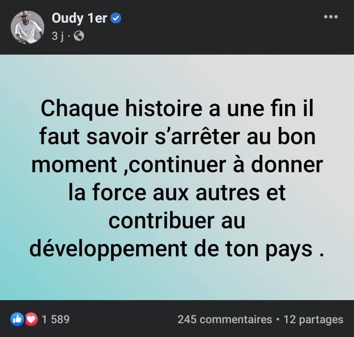 Avant de faire quelques heures plus tard une autre publication, dans laquelle il dit : « chaque histoire a une fin, il faut savoir s’arrêter au bon moment, continuer à donner de la force aux autres et contribuer au développement de ton pays ». Des publications qui ont largement fait réagir les fans de l’artiste.