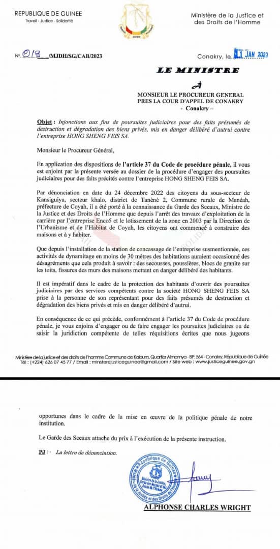 Le ministre de la justice et des droits de l’Homme, Alphonse Charles Wright a instruit l’engagement de poursuites judiciaires contre l’entreprise Hong Sheng FEIS S.A, pour des faits présumés de destruction et dégradation de bien privés, mis en danger délibéré d’autrui.