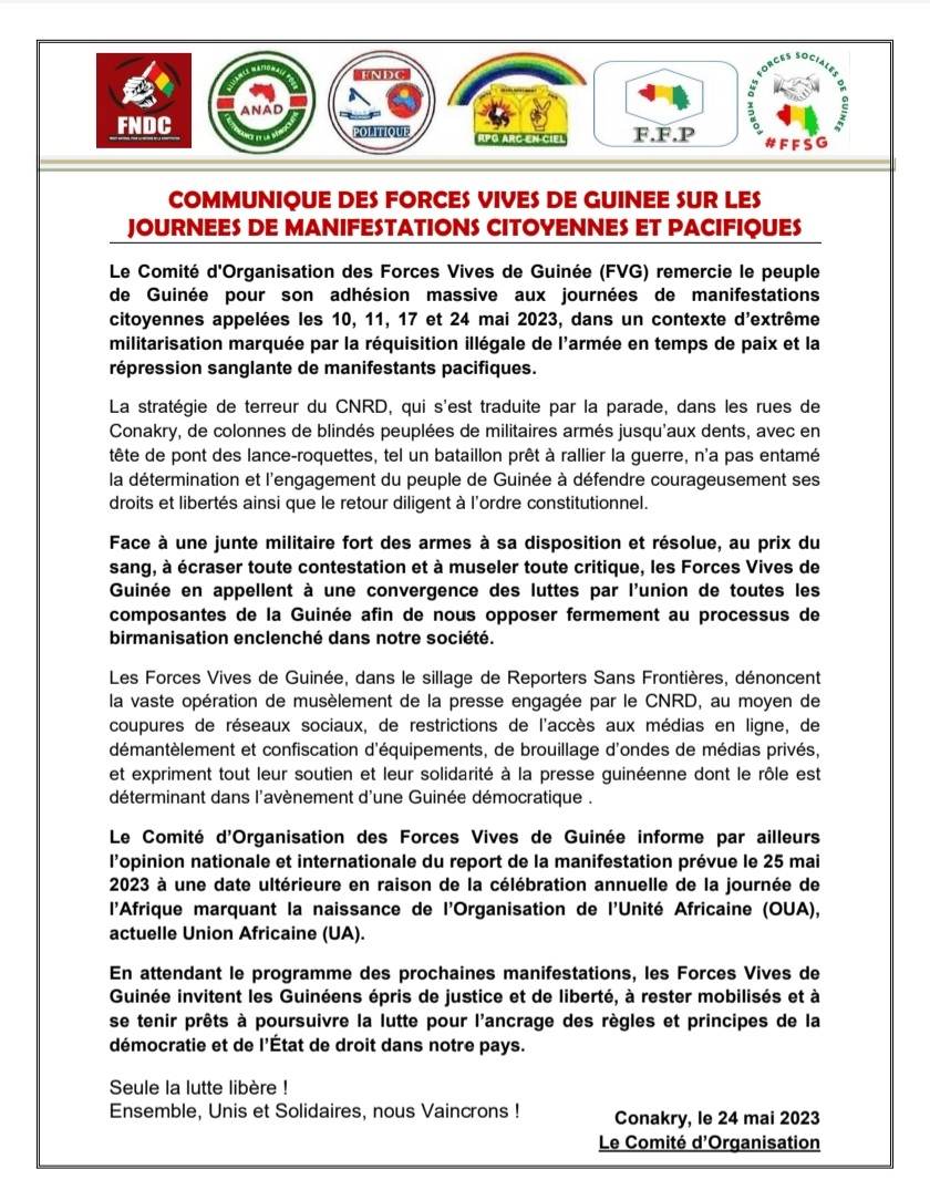 Les Forces vives de Guinée (FVG) ont annoncé mercredi le report de leur manifestation du jeudi 25 mai à une date ultérieure « en raison de la célébration annuelle de la journée de l’Afrique »