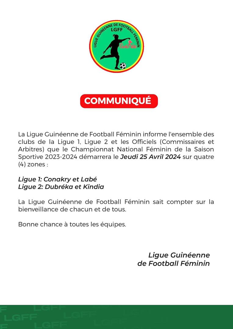 CONAKRY- Dans un courrier, la Ligue Guinéenne de Football Féminin récemment mise en place et présidée par Fatoumata Binta BERETE, a annoncé le lancement officiel du championnat féminin.