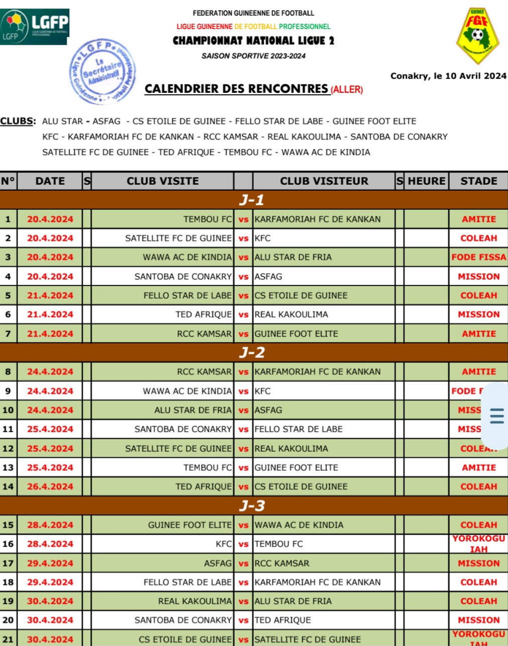 Selon un calendrier publié par la Ligue Guinéenne de Football, les 14 clubs engagés dans cette compétition seront sur le ring le 20 avril avec déjà 4 matchs programmés ce jour-là. Le promu Tembou FC recevra à Kamsar Karfamaroriah, le Satellite FC croisera le fer à Coleah avec Kaloum FC, Wawa AC défiera à Kindia Alu Star de Fria et le Santoba FC et l’association sportive des forces armées de Guinée (ASFAG) seront opposés au stade de la mission de Kaloum.