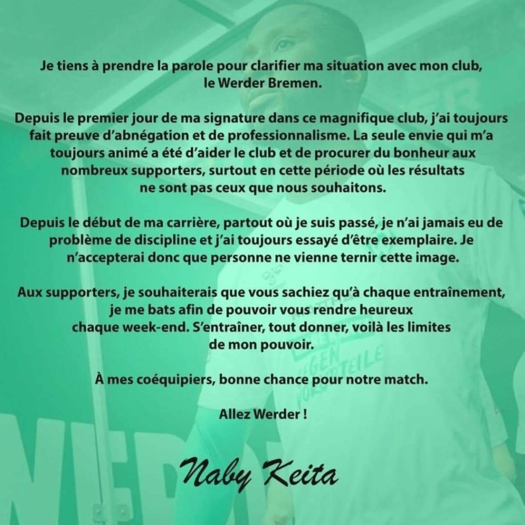 Le Guinéen était absent de ce match et le directeur du club s’est prononcé en ces termes « Naby Keita a découvert qu’il ne jouerait pas contre Leverkusen dès le début, il a décidé de ne pas monter dans le bus et de rentrer chez lui. Nous parlerons à Keita et à son agent des conséquences et de la façon de procéder. »