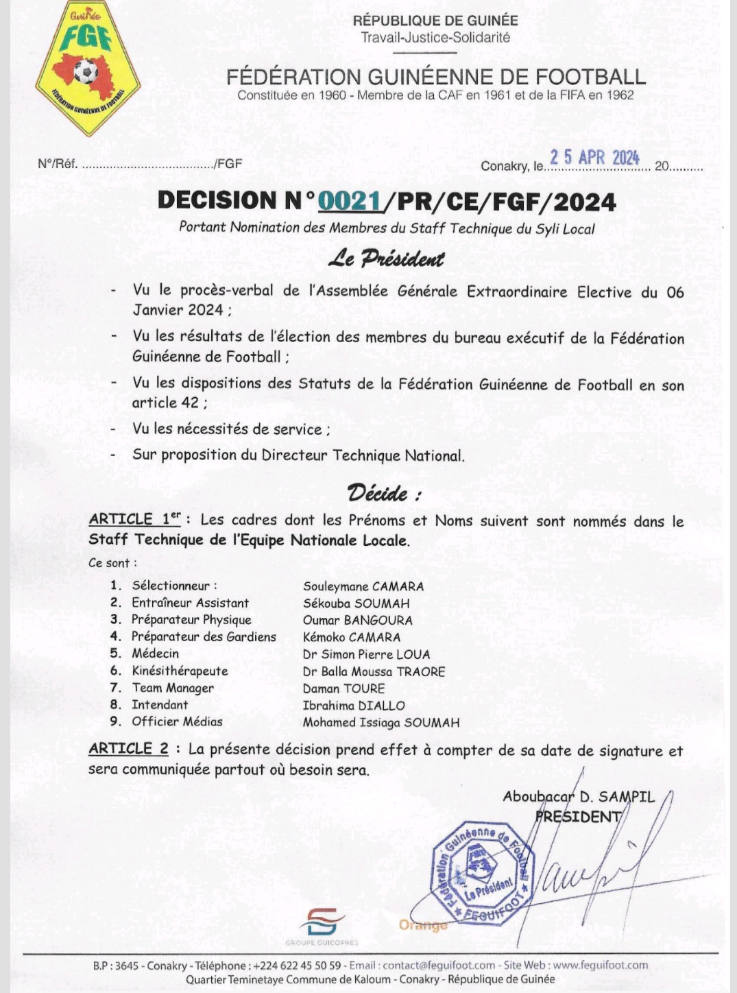 CONAKRY- Dans une décision prise ce jeudi 25 avril, la fédération Guinéenne de Football a annoncé la composition du nouveau staff technique du Syli National local de Guinée. Cette sélection est en lice pour se qualifier au prochain CHAN.