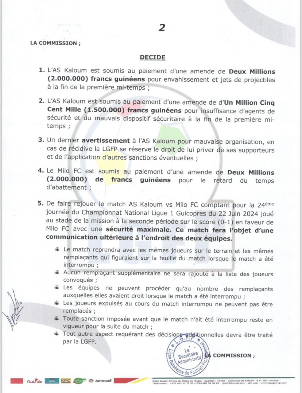 Se basant sur les rapports du match, la LGFP a décidé de faire rejouer le match pour juste les 45 minutes restantes au compte de la deuxième période, avec le score de 1-0 en faveur du Milo qui menait avant l’interruption du match. Aussi, des sanctions financières ont été prises à l’encontre des deux clubs. Pour envahissement du terrain de ses support, jets de projectiles, insuffisance d’agents de sécurité, l’AS Kaloum écope d’une amende de 3 millions 500 mille francs guinéens en tout (3.500.000 GNF). Quant au Milo FC, il devra payer la somme de 2 millions GNF (2.000.000 GNF) pour le retard du temps d’abattement.