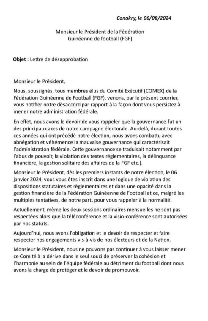 Ces membres indiquent dans une correspondance adressée à Bouba Sampil leur désaccord sur la gestion de l’administration fédérale. Pis, Sory Doumbouya (Vice-président), Mamadou Barry (Vice-président) à ne citer que ceux-là parlent de la violation des dispositions statutaires et réglementaires y compris l’opacité dans la gestion financière de l’instance par le president Bouba Sampil depuis leur élection le 6 janvier 2024.