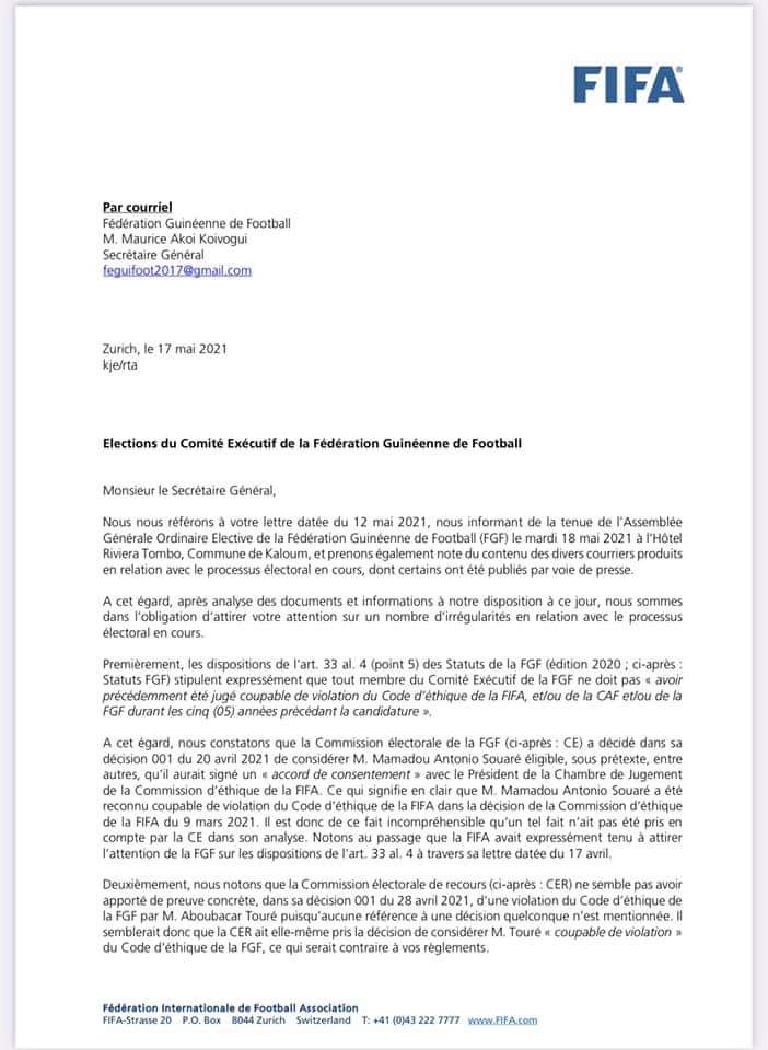 C’est officiel. La Fifa dans un courrier adressé lundi au Secrétaire général de la Fédération guinéenne de football (FGF*Féguifoot) demande de surseoir aux élections du Comité exécutif (COMEX) de la FGFde ce mardi, 18 mai. Courrier…