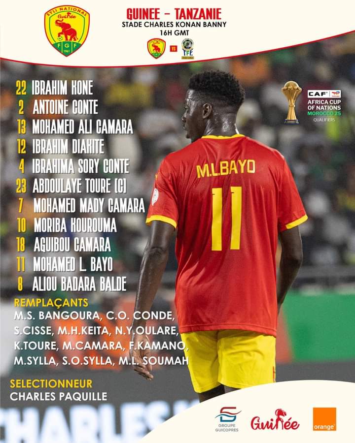 YAMOUSSOKRO- Charlie Paquillé a procédé à des changements dans le onze de départ du Syli contre la Tanzanie. François Kamano Kamano, auteur d’un match très décevant contre la RDC, céde sa place à Aliou Badara Baldé. En défense, Julian Jeanvier est remplacé par Ibrahima Sory Conté. Antoine Conté aussi prend aussi la place de Sékou Oumar Sylla, alors que Moriba Kourouma a supplé Morlaye Sylla. Le match se joue à Yamoussokro à 16h en direct sur la RTG.
