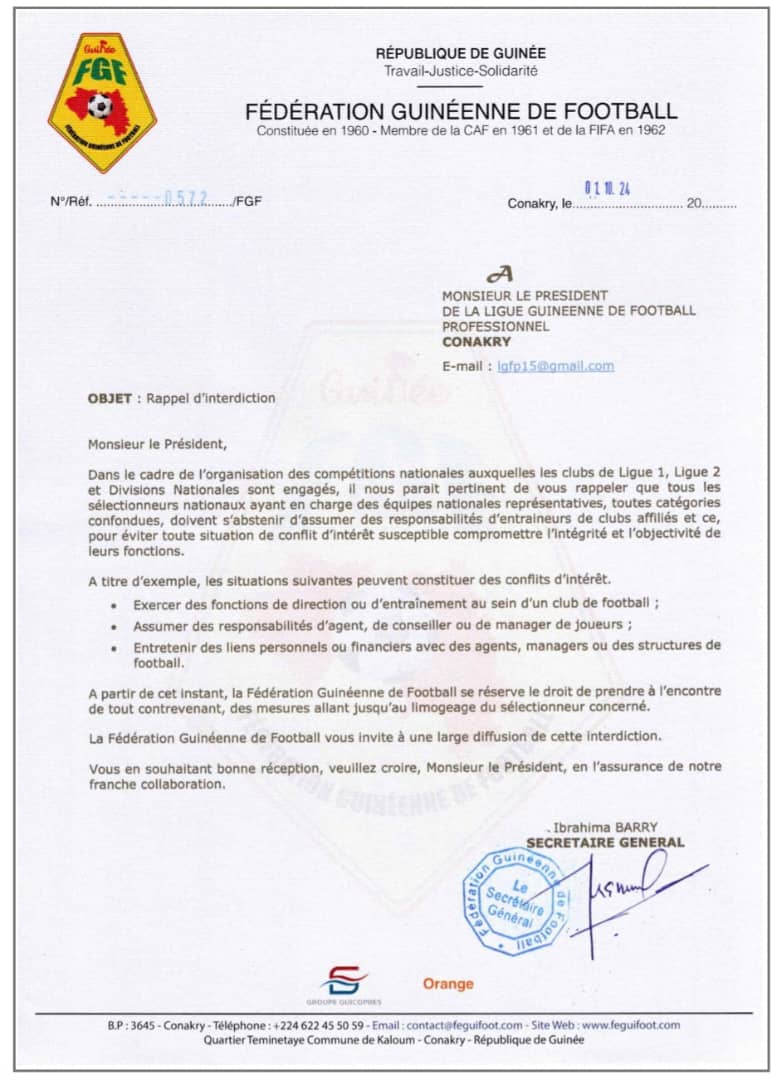 CONAKRY- ll n’y aura plus de cumul de fonction pour les sélectionneurs nationaux de la Guinée toutes catégories confondues pour éviter toute situation de conflit d’intérêt. C’est une décision de la Feguifoot rendue publique ce mardi via un courrier adressé au président de la ligue Guinéenne du football professionnel.