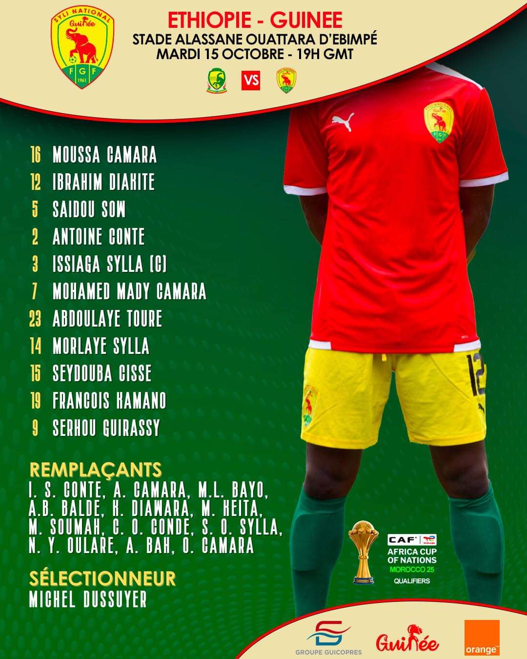 C’est Ibrahima Sory Conté Song qui fait les frais et qui laisse sa place à Antoine Conté. C’est le seul changement effectué, sinon les autres sont bien titulaires, à commencer par François Kamano, décrié pzr des observateurs et supporters pour son mauvais match réalisé contre l’Éthiopie, mais qui démarre, tout comme le phénomène Sehrou Guirassy.