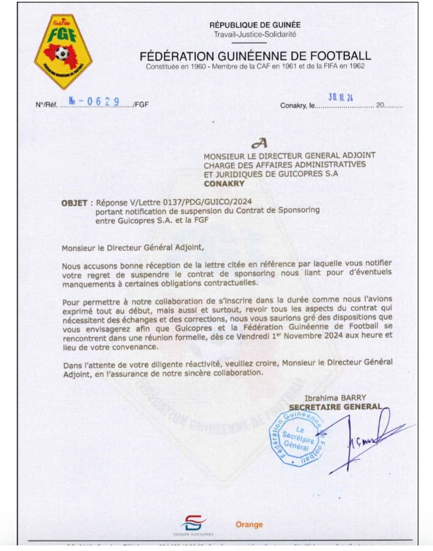 “pour permettre notre collaboration de s’inscrire dans la durée mais aussi revoir les aspects du contrat qui nécessitent des échanges et des corrections, nous vous saurions gré des dispositions que vous envisagerez afin que Guicopres et la Féguifoot se rencontrent dans une réunion formelle aux heures et lieu de votre convenance ” souhaite la Féguifoot. Si ce contrat est stoppé, la reprise du championnat est fortement compromise et le football local prendrait un sacré coup dur.