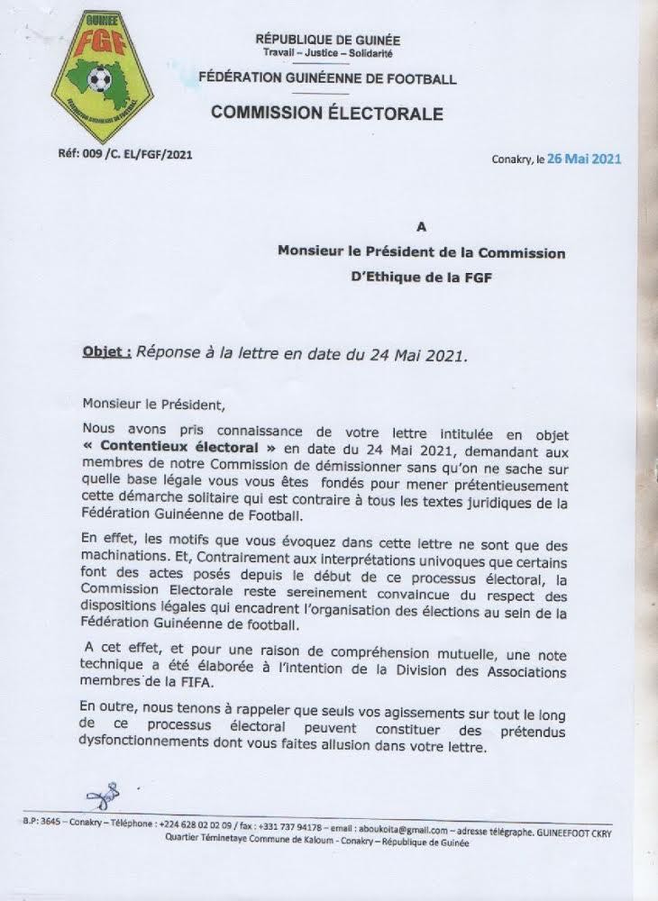 Dans un précédent article, on vous publiait un courrier signé par Amadou Tham Camara, président de la commission d’éthique de la Fédération guinéenne de football, adressé aux présidents de la commission électorale et de la commission électorale de recours, leur demandant de démissionner.