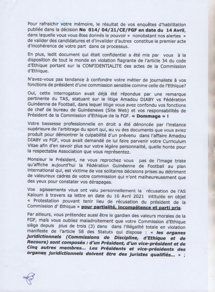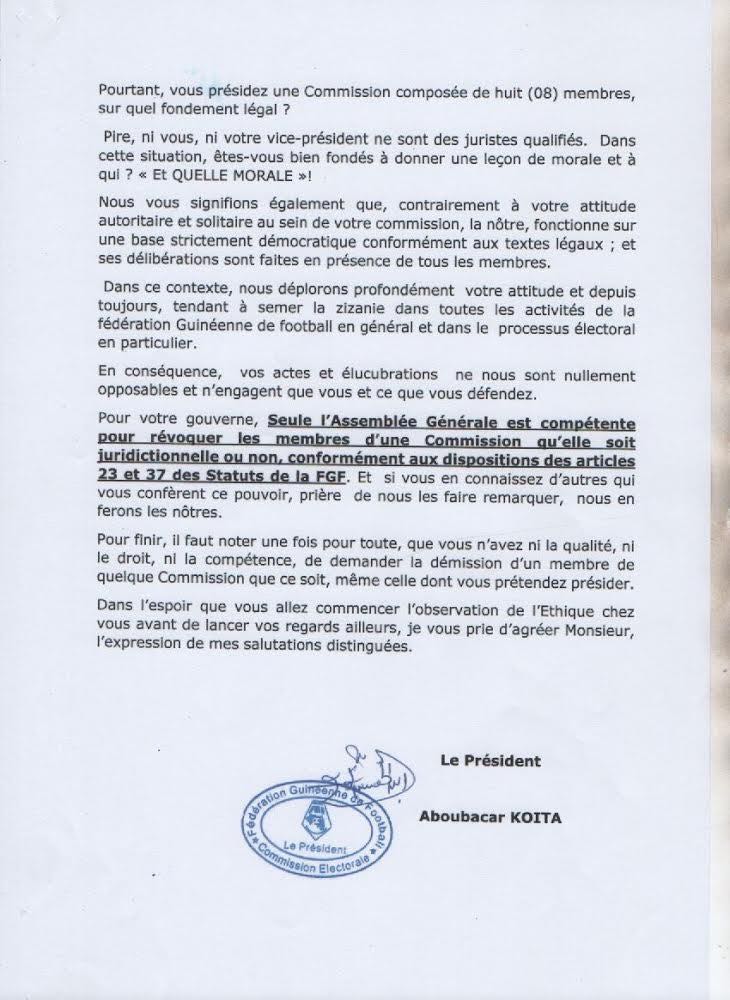 Aboubacar Koita estime également que la commission d’éthique de la fédération guinéenne de football dirigée par Amadou Tham Camara siège illégalement depuis trois ans en violation de l’article 58 des statuts. Il accuse aussi Tham Camara par ailleurs journalistes de mettre à la disposition de tout le monde un document sensé être confidentiel.