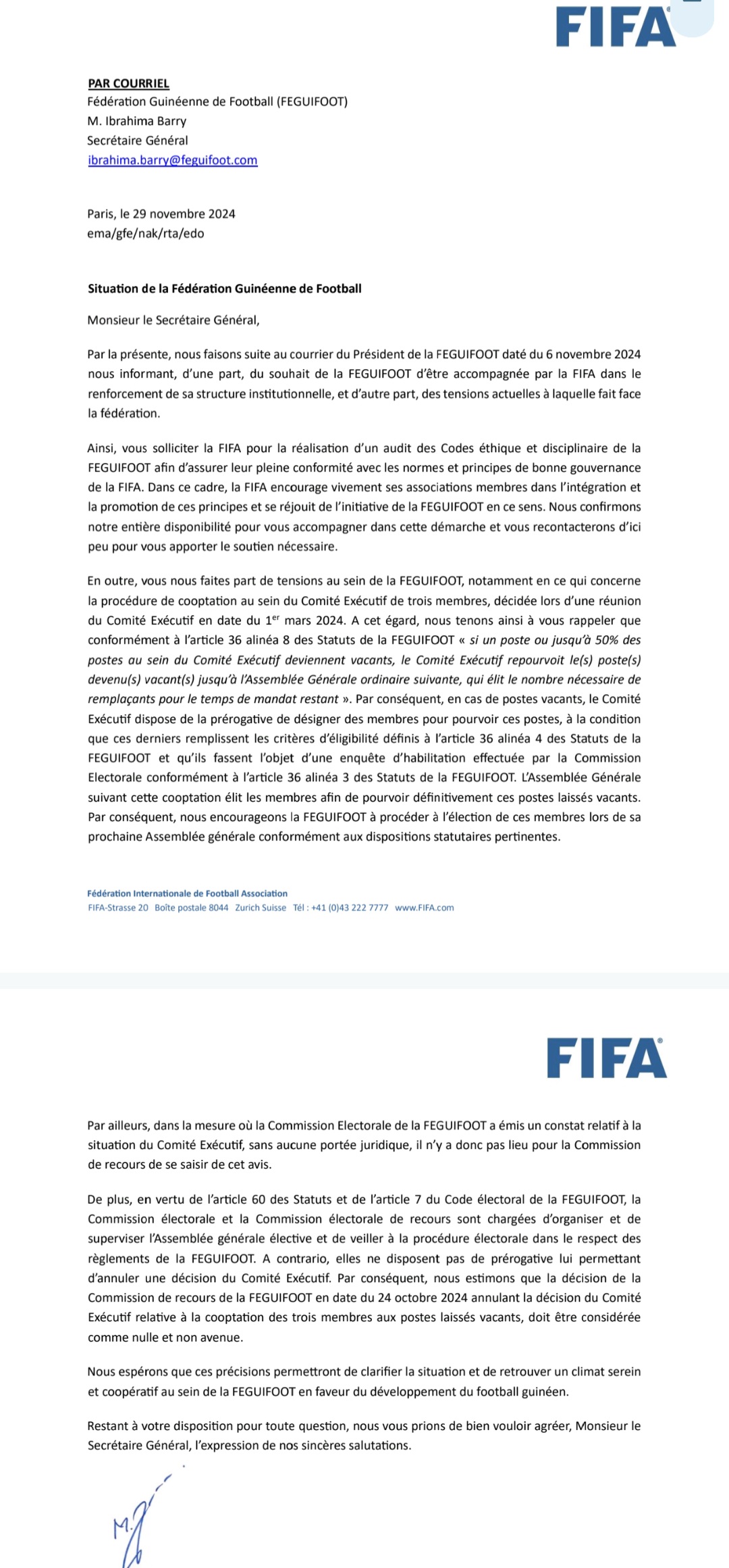 La FIFA considère la sortie de la commission électorale de recours annulant la décision du comex relative à la cooptation des trois membres aux postes laissés vacants, nulle et non avenue. La cooptation de 3 membres faite par Bouba Sampil est donc bien valable. La FIFA rappelle les acteurs du comité exécutif à conjuguer le même verre pour le bonheur du football guinéen.