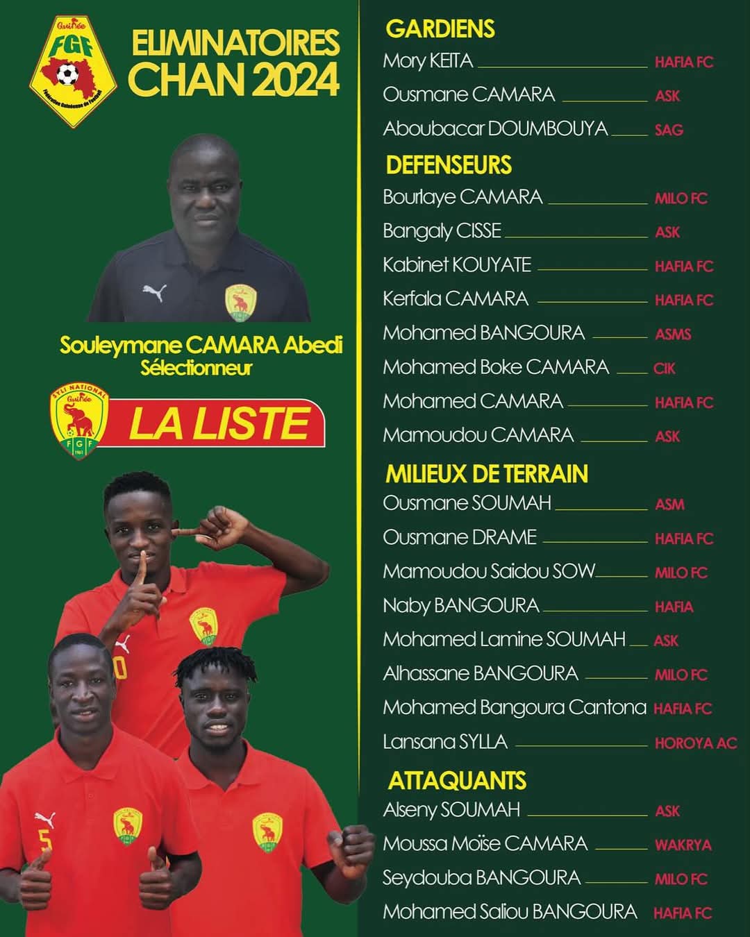 Le sélectionneur Souleymane Camara Abedy a dévoilé sa liste de joueurs retenus, liste dans laquelle c’est le Hafia FC qui est le club le plus représenté avec pas moins de 7 joueurs. Le Horoya n’a qu’un seul élément retenu à savoir le jeune talent très prometteur Lansana Sylla. A préciser que l’équipe affûte ses armes à Conakry avant de s’envoler les prochains jours pour Abidjan oû elle sera opposée aux Éléphants locaux le 15 décembre prochain en match amical..