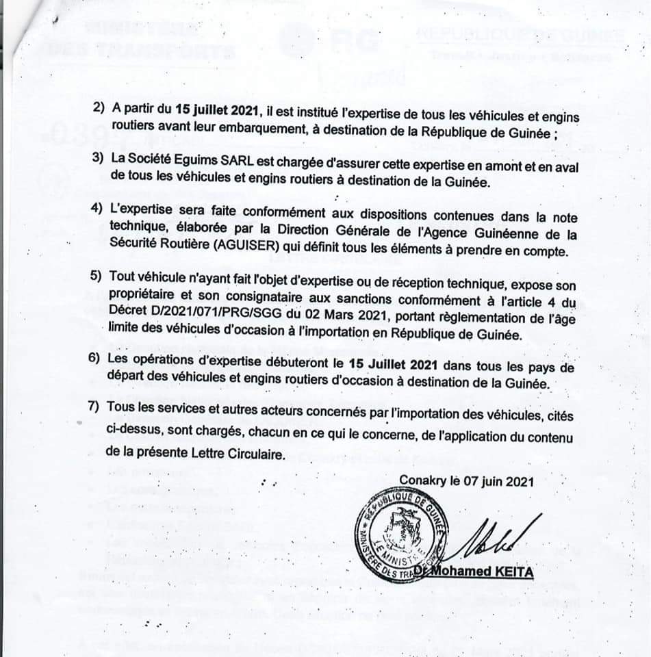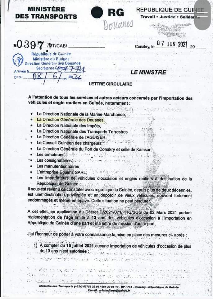 En application du décret sur les importations des véhicules et engins routiers en Guinée, le ministre des Transports Ibrahima Keita annonce dans une lettre circulaire qu’à compter du 15 juillet prochain, “aucune importation de véhicules d’occasion de plus de 13 ans n’est autorisée”