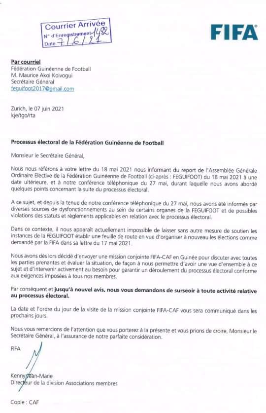 C’est pourquoi, la FIFA écrit ceci : “Nous avons dès lors décidé d’envoyer une mission FIFA-CAF en Guinée pour discuter avec toutes les parties prenantes et d’évaluer la situation, de façon à nous permettre d’avoir une vue d’ensemble à ce sujet et d’intervenir activement au besoin pour garantir un déroulement du processus électoral conforme aux exigences imposées à tous nos membres. Par conséquent et jusqu’à nouvel avis, nous vous demandons de surseoir à toute activité relative au processus électoral” explique la FIFA.