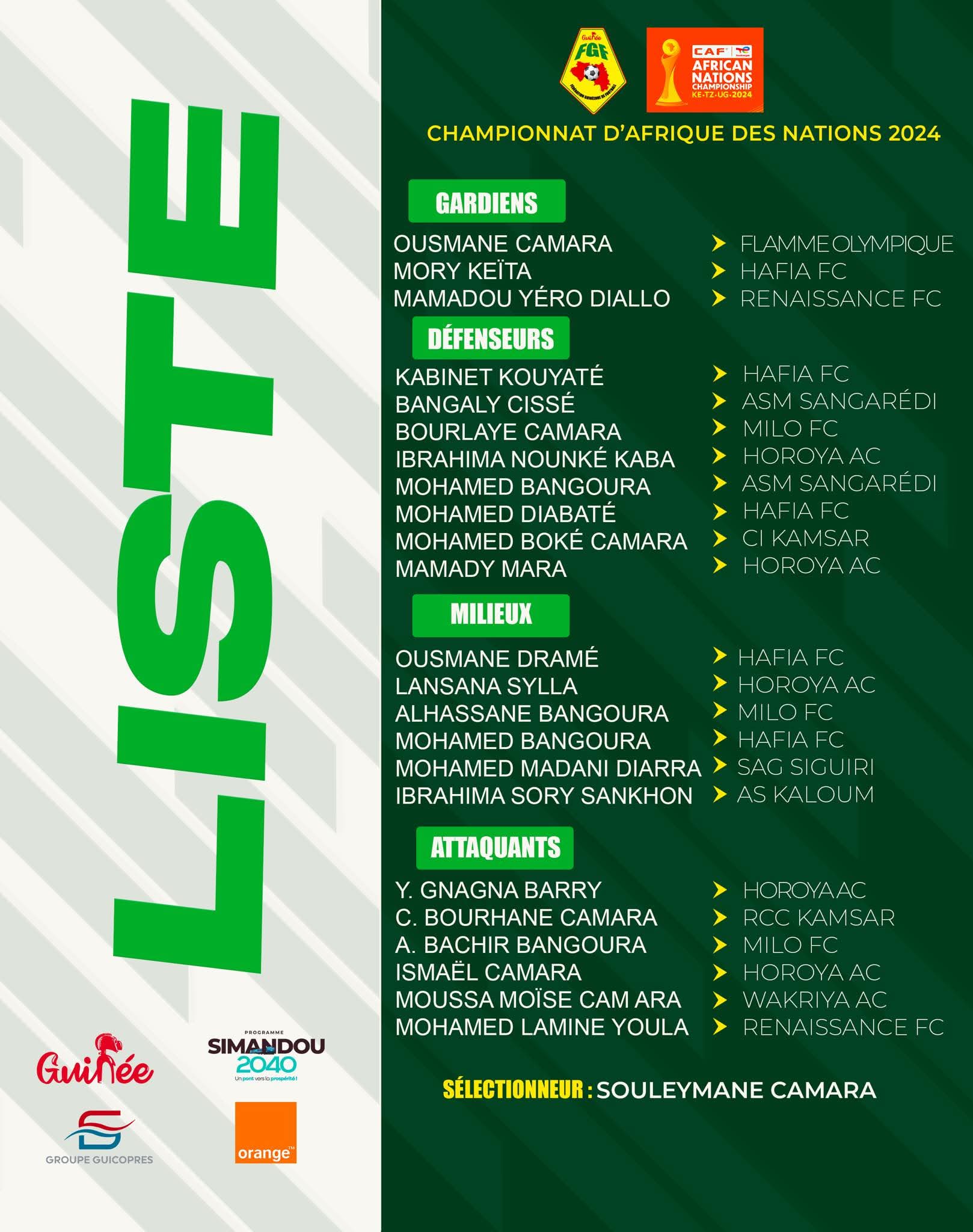 Sur cette liste, on note le retour de Moussa Moise Camara du Wakriya, qui a terminé meilleur buteur du championnat guinéen et qui était absent du dernier stage au Sénégal. Ibrahima Sory Sankhon de l’AS Kaloum est convoqué, lui qui avait déjà pris part au CHAN 2016 au Rwanda, et dont le retour en sélection fait polémiques. Le gardien du Horoya Salifou Sylla, élu Meilleur gardien par la Ligue, est laissé à la touche. Le sélectionneur Souleymane Camara explique que ce dernier n’a pas convaincu lors des deux matchs amicaux disputés contre le Sénégal, d’où sa non-sélection.