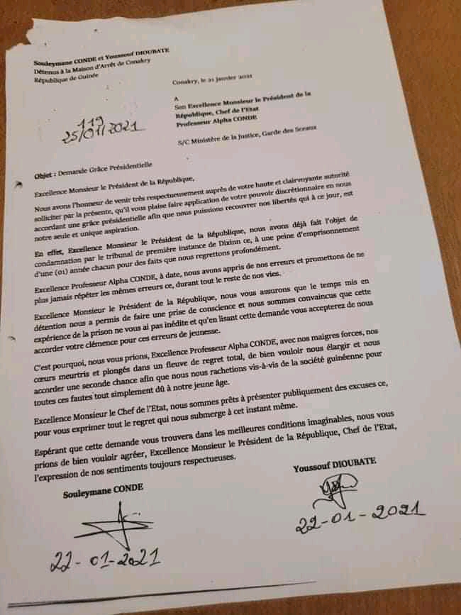 Souleymane Condé et Youssouf Dioubaté ont dans une lettre commune demandé la clémence du chef de l’Etat. Le premier, condamné à 1 an de prison ferme et le second également à la même peine ont invité le président Alpha Condé à leur donner une seconde chance en vue de se “racheter vis-à-vis de la société guinéenne pour tiutes ces fautes…”