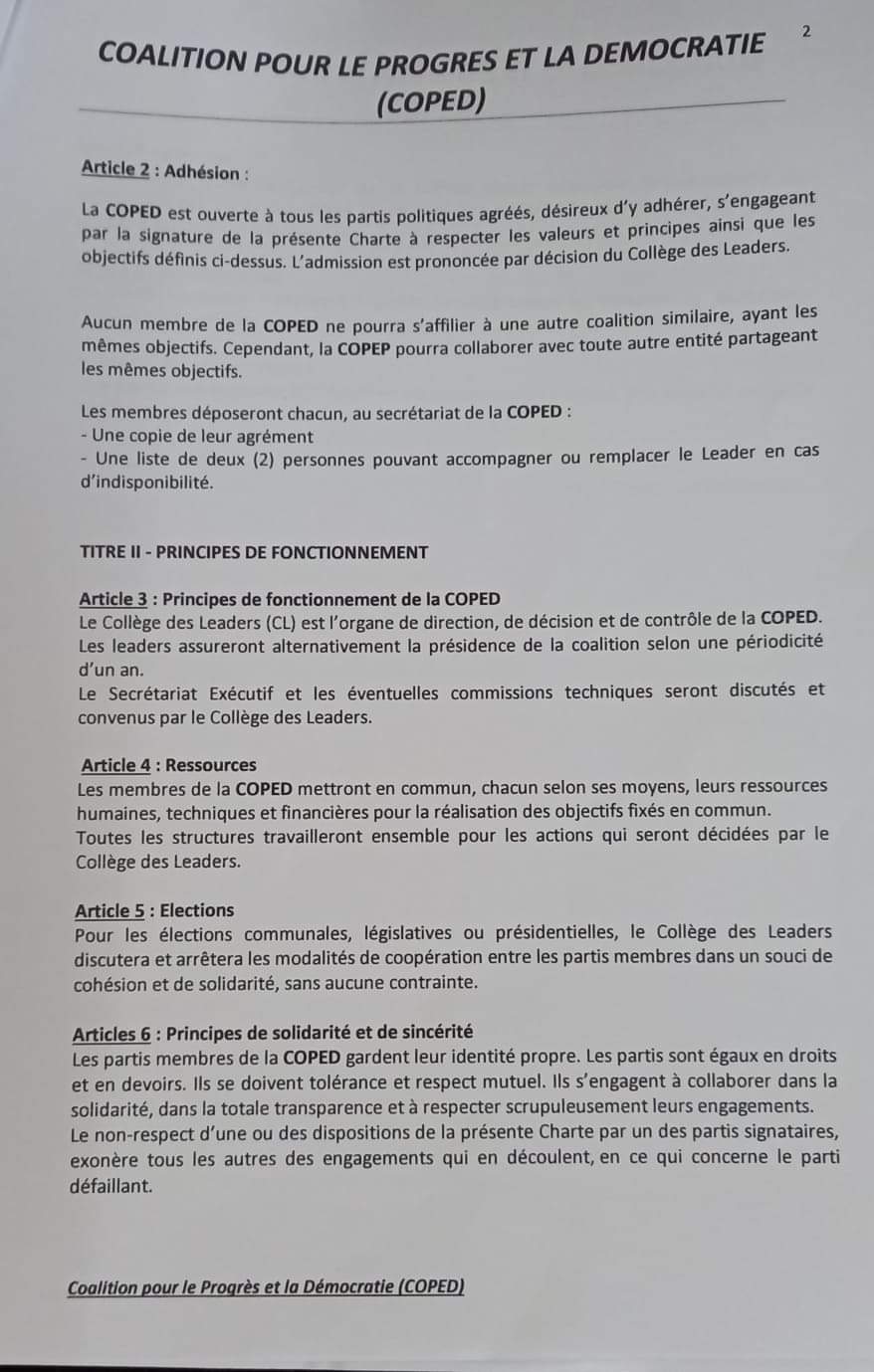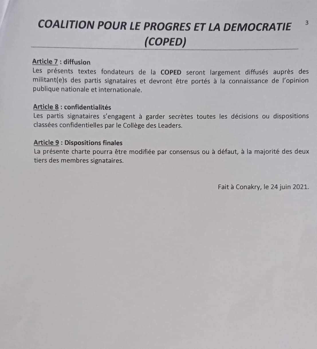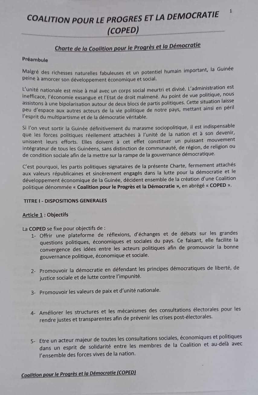Des  partis politiques composés du PADES du Dr Ousmane Kaba, du RRD de Abdoulaye Kourouma, du PDG-RDA de Oyé Béavogui, du MND du Dr Ousmane Doré, du PGSD de Élie Kamano, du PPD de Boubacar Diallo, de la NGR de Ibrahima Abé Sylla ont créé une nouvelle coalition politique dénommée “Coalition pour le Progrès et la Démocratie (COPED). L’annonce a été faite ce Jeudi 24 juin, à la maison de la presse. Ci dessous, la charte de la coalition….