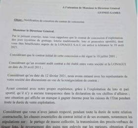 La LONAGUI S.A.U a notifié à GUINEE GAMES la cessation effective de toutes ses activités d’exploitation de jeux sur toute I...